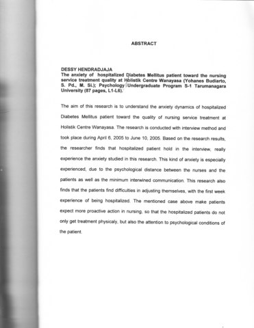 Hendradjaja, Dessy (2005) Kecemasan pasien rawat inap penderita diabetes mellitus terhadap kualitas layanan perawat Holistic Centre Wanaya. Skripsi thesis, universitas Tarumanagara.