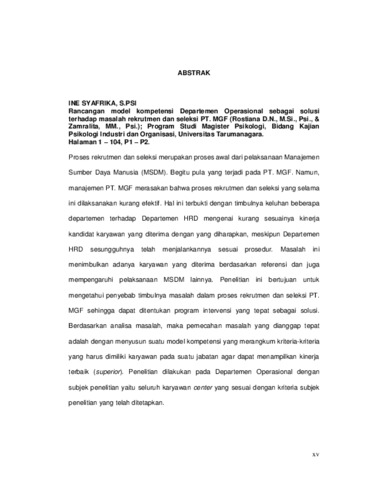 Proses rekrutmen dan seleksi merupakan proses awal dari pelaksanaan Manajemen Sumber Daya Manusia (MSDM). Begitu pula yang terjadi pada PT. MGF. Namun, manajemen PT. MGF merasakan bahwa proses rekrutmen dan seleksi yang selama ini dilaksanakan kurang efektif. Hal ini terbukti dengan timbulnya keluhan beberapa departemen terhadap Departemen HRD mengenai kurang sesuainya kinerja kandidat karyawan yang diterima dengan yang diharapkan, meskipun Departemen HRD sesungguhnya telah menjalankannya sesuai prosedur. Masalah ini menimbulkan adanya karyawan yang diterima berdasarkan referensi dan juga mempengaruhi pelaksanaan MSDM lainnya. Penelitian ini bertujuan untuk mengetahui penyebab timbulnya masalah dalam proses rekrutmen dan seleksi PT. MGF sehingga dapat ditentukan program intervensi yang tepat sebagai solusi. Berdasarkan analisa masalah, maka pemecahan masalah yang dianggap tepat adalah dengan menyusun suatu model kompetensi yang merangkum kriteria-kriteria yang harus dimiliki karyawan pada suatu jabatan agar dapat menampilkan kinerja terbaik (superior). Penelitian dilakukan pada Departemen Operasional dengan subjek penelitian yaitu seluruh karyawan center yang sesuai dengan kriteria subjek penelitian yang telah ditetapkan.