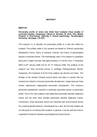 This research try to describe the personality profile of a wife who killed her husband. The profiles made in this research are based on Erikson's personality development theory, theory of domestic violence, and theory of psychological impacts of battered woman. The methodology used in this research is qualitative along with in-depth interview held approximately in 3 months, from 1st November 2005 to 25th January 2006 and 23, 25, 27 February 2006. The subjects of this research are three convicted women in Lembaga Pemasyarakatan Wanita, Tangerang. The husbands of all the three subjects are abusive and cheat. The findings of this research showed several factors that lead a a woman kills her husband are related to immature personality development stages because these woman experienced inappropriate personality development. This immature personality development resulted in a particular personality pattern or personality profile. Two of the three subjects meet dependent personality disorder diagnostic criteria and the other meet avoidant personality disorder diagnostic criteria. Furthermore, those personality factors are interacted with environmental factors thus creating spesific behavior, manslaughter by a wife. All the three subjects do not feel guilty for murdering their husband. In general, it can be said that there is a significant interaction between psychological and social factors.