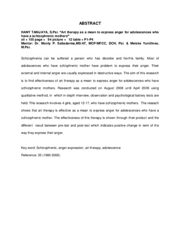Tanijaya, Hany (2009) Art Therapy Sebagai Sarana Mengekspresikan Kemarahan Pada Remaja Yang Memiliki Ibu Dengan Gangguan Skizofrenia. Masters thesis, Universitas Tarumanagara.