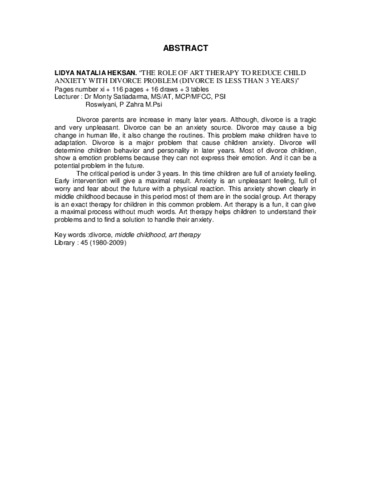 Natalia Heksan, Lidya (2010) Peran art therapy dalam mengurangi kecemasan pada middle childhood yang mengalami perceraian orang tua (perceraian kurang dari tiga tahun). Masters thesis, Universitas Tarumanagara.