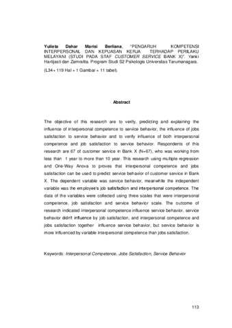 The objective of this research are to verify, predicting and explaining the influence of interpersonal competence to service behavior, the influence of jobs satisfaction to service behavior and to verify influence of both interpersonal competence and job satisfaction to service behavior. Respondents of this research are 67 of customer service in Bank X (N=67), who was working from less than 1 year to more than 10 year. This research using multiple regression and One-Way Anova to proves that interpersonal competence and jobs satisfaction can be used to predict service behavior of customer service in Bank X. The dependent variable was service behavior, meanwhile the independent variable was the employee’s job satisfaction and interpersonal competence. The data of the variables were collected using three scales that were interpersonal competence, job satisfaction and service behavior scale. The outcome of research indicated interpersonal competence influence service behavior, service behavior didn’t influence by job satisfaction, and interpersonal competence and jobs satisfaction together influence service behavior, but service behavior is more influenced by variable interpersonal competence than jobs satisfaction.
