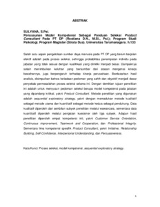 Salah satu aspek pengelolaan sumber daya manusia pada PT DP yang belum berjalan efektif adalah pada proses seleksi, sehingga probabilitas penempatan individu pada jabatan yang tidak sesuai dengan kualifikasi yang dimiliki menjadi besar. Dampaknya selain menimbulkan keluhan yang bersumber dari atasan mengenai kinerja bawahannya, juga berpengaruh terhadap kinerja perusahaan. Berdasarkan hasil analisis, disimpulkan bahwa ketiadaan pedoman yang sahih dan obyektif menjadi dasar penyebab permasalahan proses seleksi selama ini. Dengan demikian tujuan penelitian ini adalah untuk menyusun pedoman seleksi berupa model kompetensi pada jabatan yang dipandang kritikal, yakni Product Consultant. Metode penelitian yang digunakan adalah sequential exploratory strategy, yakni dengan memadukan metode kualitatif sebagai metode utama dan kuantitatif sebagai metode kedua sebagai pendukung. Data kualitatif diperoleh dari sembilan subyek penelitian melalui wawancara, sementara data kuantitatif diperoleh melalui pengisian kuesioner oleh tiga subyek. Adapun hasil penelitian diperoleh empat kompetensi inti, yakni Customer Service Orientation, Continuous improvement, Teamwork and Cooperation, dan Professional Integrity. Sementara lima kompetensi spesifik Product Consultant, yakni Initiative, Relationship Building, Self-Confidence, Interpersonal Understanding, dan Persuasiveness.