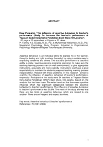 Assertive behaviour is an individual ability to express his or her opinion, thoughts, feeling and right to others (honestly) by using a suitable way in respecting ourselves and others. The teacher’s performance is teacher’s ability to make teaching planning programs (planning); to make sure the teaching learning process can run well (environment); to give appropriate instructions, accurately and more explicitly (instruction); and have a great responsibility to maintain the students progress teaching learning process (responsibility). Related with these problems, in this research aimed to examine the influence of assertive behaviour of teacher’s performance, empirically. Participant of the study were 64 teachers at Yayasan Badan Kerja Sama Pendidikan (BKSP) Bakti Mulya 400 Jakarta. Based on, the analysis that had been done. The writer found out that there was a positive influence which had significant categorized between the assertive behaviour to teacher’s performance. The influence of assertive behaviour to teacher’s performance was 59,8%. The result of the study showed that there are two kinds of assertive behaviour which are related to one another. There are self respect and respect to others.