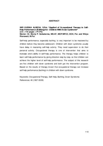 Kurnia Almesa, Inri (2010) Penerapan Terapi Okupasi terhadap Kemampuan Bantu Diri pada Anak Down Syndrome. Masters thesis, Universitas Tarumanagara.