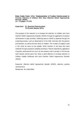 Dwika Putri, Nidya (2010) Penerapan Positive Reinforcement untuk Meningkatkan Atensi Anak yang Mengalami Attention Deficit Hyperactivity Disorder (ADHD). Masters thesis, Universitas Tarumanagara.