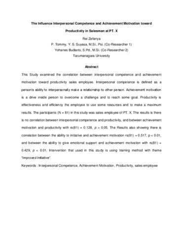 Zefanya, Rei (2010) Pengaruh Kompetensi Interpersonal dan Motivasi Berprestasi terhadap Produktifitas Karyawan Sales di PT. X. Masters thesis, Universitas Tarumanagara.