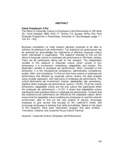 Business competition on hotel industry demand corporate to be able to optimize its employee’s job performance. Top employee job performance can be achieved by acknowledge the importance of effective corporate culture which internalized in organization. This research intended to find out the effect of corporate culture on employee job performance in CM Hotel, Jakarta. There are 80 participants taking part on this research. The independent variable of this research is corporate culture, which consist of four dimensions, it is involvement, consistency, adaptability, and mission. The dependent variable is employee job performance, which consisted of five dimension, it is the interpersonal competence, administrative competence, quality, effort, and compliance. To find out how many varians of employee job performance that effected by corporate culture varians, the data analysis using multiple regression, with total score of employee job performance. The culture dimensions are involvement, mission, adaptability, dan consistency, together effect employee job performance varians = 23.8%. Of all the culture dimensions, adaptability culture are the only culture that significantly effect the employee job performance = 21,5%. It shows that adaptability culture significantly have possitive effect on employee job performance. It means that the employee’s job performance are effected by the adaptable culture, which means that the adaptable culture enabling the employees to read the external environment, able to find out the new product of service, encourage employee to give service that focused on the customer’s needs, and encourage employees to develop their skills and abilities. Based on the result of this research, there were intervention program that were entitled : “Innovative, Creative, and Customer Focus Culture Training”