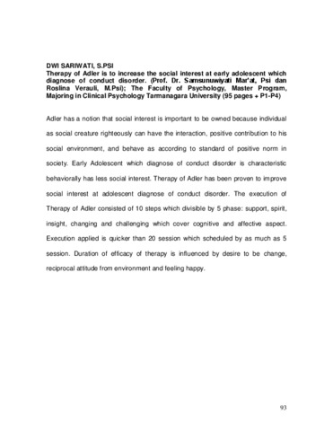 Adler has a notion that social interest is important to be owned because individual as social creature righteously can have the interaction, positive contribution to his social environment, and behave as according to standard of positive norm in society. Early Adolescent which diagnose of conduct disorder is characteristic behaviorally has less social interest. Therapy of Adler has been proven to improve social interest at adolescent diagnose of conduct disorder. The execution of Therapy of Adler consisted of 10 steps which divisible by 5 phase: support, spirit, insight, changing and challenging which cover cognitive and affective aspect. Execution applied is quicker than 20 session which scheduled by as much as 5 session. Duration of efficacy of therapy is influenced by desire to be change, reciprocal attitude from environment and feeling happy.