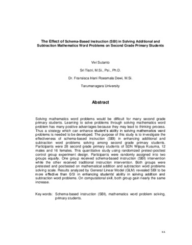 Solving mathematics word problems would be difficult for many second grade primary students. Learning to solve problems through solving mathematics word problem has many positive advantages because they may lead to thinking process. Thus a strategy which can enhance student’s ability in solving mathematics word problems is needed to be developed. The purpose of this study is to investigate the effectiveness of schema-based instruction (SBI) in enhancing additional and subtraction word problems solving among second grade primary students. Participants were 28 second grade primary students of SDN Wijaya Kusuma, 12 males and 16 females. This quantitative study using randomized pretest-posttest control group experiment design. Participants were randomly assigned into two groups equally. One group received schema-based instruction (SBI) intervention while the other received traditional instruction intervention. Both groups were pretested and posttested on mathematical addition and subtraction word problems solving scale. Results analyzed by General Linear Model (GLM) revealed SBI to be more effective than GSI in enhancing students’ ability in solving addition and subtraction word problems. On computational skill, both group gain nearly the same increase.