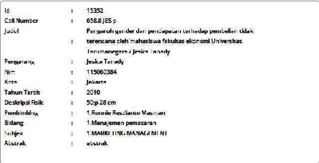Tanady, Jesica (2010) Pengaruh gender dan pendapatan terhadap pembelian tidak terencana oleh mahasiswa fakultas ekonomi Universitas Tarumanegara. Skripsi thesis, Universitas Tarumanagara.