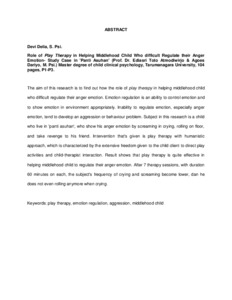The aim of this research is to find out how the role of play therapy in helping middlehood child who difficult regulate their anger emotion. Emotion regulation is an ability to control emotion and to show emotion in environment appropriately. Inability to regulate emotion, especially anger emotion, tend to develop an aggression or behaviour problem. Subject in this research is a child who live in 'panti asuhan', who show his anger emotion by screaming in crying, rolling on floor, and take revenge to his friend. Intervention that's given is play therapy with humanistic approach, which is characterized by the extensive freedom given to the child client to direct play activities and child-therapist interaction. Result shows that play therapy is quite effective in helping middlehood child to regulate their anger emotion. After 7 therapy sessions, with duration 60 minutes on each, the subject's frequency of crying and screaming become lower, dan he does not even rolling anymore when crying