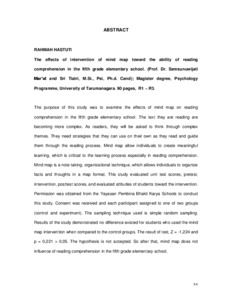 The purpose of this study was to examine the effects of mind map on reading comprehension in the fifth grade elementary school. The text they are reading are becoming more complex. As readers, they will be asked to think through complex themes. They need strategies that they can use on their own as they read and guide them through the reading process. Mind map allow individuals to create meaningful learning, which is critical to the learning process especially in reading comprehension. Mind map is a note-taking, organizational technique, which allows individuals to organize facts and thoughts in a map format. This study evaluated unit test scores, pretest, intervention, posttest scores, and evaluated attitudes of students toward the intervention. Permission was obtained from the Yayasan Pembina Bhakti Karya Schools to conduct this study. Consent was received and each participant assigned to one of two groups (control and experiment). The sampling technique used is simple random sampling. Results of the study demonstrated no difference existed for students who used the mind map intervention when compared to the control groups. The result of test, Z = -1,224 and p = 0,221 > 0,05. The hypothesis is not accepted. So after that, mind map does not influence of reading comprehension in the fifth grade elementary school.