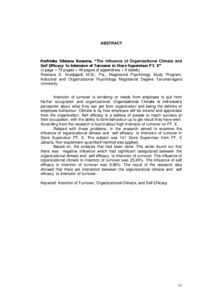 Related with these problems, in the research aimed to examine the influence of organizational climate and self efficacy to intension of turnover in Store Supervisor PT. X. The subject was 141 Store Supervisor from PT. X Jakarta. Non-experiment quantitatif method was applied.
