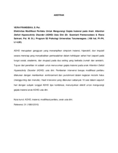 ADHD merupakan gangguan yang menampilkan simptom inatensi, hiperaktif, dan impulsif secara menetap yang menyebabkan permasalahan dalam kehidupan sehari-hari (seperti pada fungsi sosial, akademis, dan okupasi) pada dua setting yang berbeda (rumah dan sekolah). Tujuan dari penelitian ini adalah untuk menurunkan gejala inatensi pada anak Attention Deficit Hyperactivity Disorder (ADHD) usia dini. Pemberian intervensi berupa modifikasi perilaku dilakukan dengan memberikan reinforcement dan punishment dalam kegiatan motorik halus (menggunting dan menulis). Hasil intervensi yang dilakukan sebanyak 10 sesi dalam sepuluh hari dengan subyek tunggal ADHD tipe kombinasi, menunjukkan efektif untuk mengurangi gejala inatensi anak ADHD usia dini.