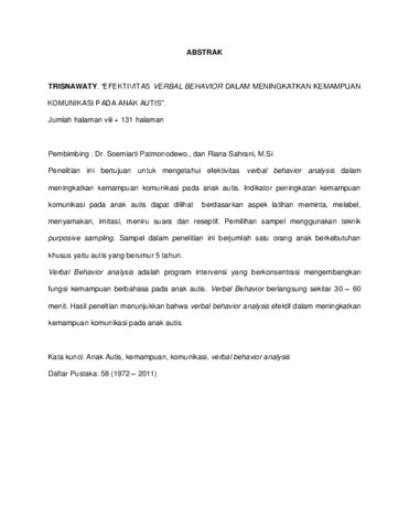 | Uncontrolled Keywords: | Anak Autis, kemampuan, komunikasi, verbal behavior analysis |