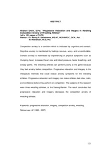 Kecemasan menjelang pertandingan pada dunia olahraga dapat ditandai kognitif maupun somatik. Kecemasan secara kognitif membuat atlet merasa gelisah dan tidak nyaman dengan dirinya sendiri. Kecemasan secara somatik dapat membuat atlet merasa jantung berdebar-debar, peningkatan tekanan darah dan denyut jantung, nafas tidak teratur, dan tangan berkeringat. Pada olahraga gulat, atlet yang mengalami kecemasan menjelang pertandingan dapat menyebabkan performance atlet menjadi tidak optimal. Relaksasi Progresif dan Imajeri merupakan terapi yang dapat membuat atlet mengurangi gejala-gejala kecemasan yang dialami saat menjelang pertandingan. Relaksas Progresif dapat membuat atlet merasa lebih tenang dan imajeri dapat membuat mental atlet lebih kuat dalam menghadapi pertandingan. Subyek penelitian ini berjumlah tiga atlet gulat yang berasal dari kota Serang propinsi Banten. Berdasarkan hasil penelitian dapat disimpulkan bahwa Relaksasi Progresif dan Imajeri dapat mengurangi kecemasan atlet gulat menjelang pertandingan.
