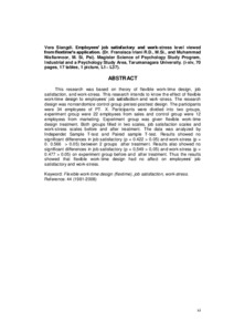 This research was based on theory of flexible work-time design, job satisfaction, and work-stress. This research intends to know the effect of flexible work-time design to employees’ job satisfaction and work-stress. The research design was nonrandomize control group pretest-posttest design. The participants were 34 employees of PT. X. Participants were divided into two groups, experiment group were 22 employees from sales and control group were 12 employess from marketing. Experiment group was given flexible work-time design treatment. Both groups filled in two scales, job satisfaction scales and work-stress scales before and after treatment. The data was analyzed by Independet Sample T-test and Paired sample T-test. Results showed no significant differences in job satisfactory (p = 0.422 > 0.05) and work-stress (p = 0. 0.566 > 0.05) between 2 groups after treatment. Results also showed no significant differences in job satisfactory (p = 0,549 > 0,05) and work-stress (p = 0.477 > 0.05) on experiment group before and after treatment. Thus the results showed that flexible work-time design had no affect on employees’ job satisfactory and work-stress.