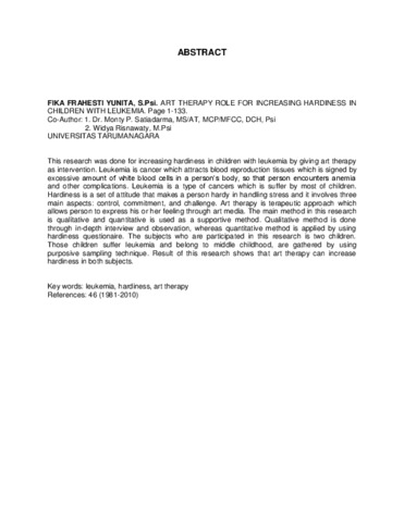 This research was done for increasing hardiness in children with leukemia by giving art therapy as intervention. Leukemia is cancer which attracts blood reproduction tissues which is signed by excessive amount of white blood cells in a person’s body, so that person encounters anemia and other complications. Leukemia is a type of cancers which is suffer by most of children. Hardiness is a set of attitude that makes a person hardy in handling stress and it involves three main aspects: control, commitment, and challenge. Art therapy is terapeutic approach which allows person to express his or her feeling through art media. The main method in this research is qualitative and quantitative is used as a supportive method. Qualitative method is done through in-depth interview and observation, whereas quantitative method is applied by using hardiness questionaire. The subjects who are participated in this research is two children. Those children suffer leukemia and belong to middle childhood, are gathered by using purposive sampling technique. Result of this research shows that art therapy can increase hardiness in both subjects