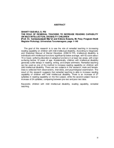 The goal of this research is to see the role of remedial teaching in increasing reading capability on children with mild intellectual disability. According to Diagnostic and Statistical Manual of Mental Disorders (DSM-IV-TR), intellectual disability is individuals with intellectual functions significantly below average, with IQ score about 70 or lower, suffering disorders in adaptive functions in at least two areas, with onset surfacing before 18 years of age. Academically, children with intellectual disability generally suffer delays in reading, writing, and simple arithmetic. Remedial teaching can be used as one of the method to increase reading capability on children with mild intellectual disability. There are two subjects in this research, male and female. Data is collected from observations, interviews, and psychological examination. The result of this research suggests that remedial teaching is able to increase reading capability of children with mild intellectual disability. There is an increase of 27 syllables in reading capability on the first subject, while the second subject have an increase of 24 syllables, comparing between pre-test and post-test data.