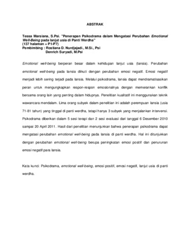 Marsiana, Tessa (2011) Penerapan psikodrama dalam mengatasi perubahan emotional well-being pada lanjut usia di Panti Werdha. Masters thesis, Universitas Tarumanagara.