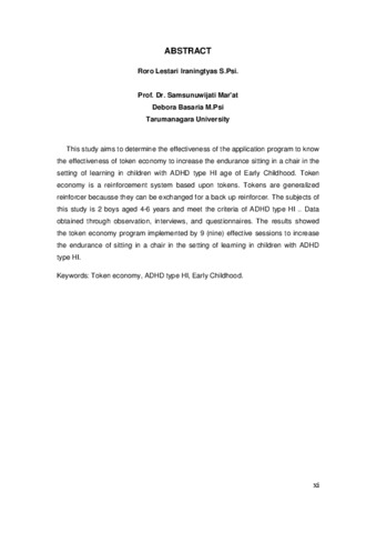 I, Roro Lestari (2011) Penerapan token economy untuk meningkatkan ketahanan duduk di kursi dalam setting belajar pada anak ADHD tipe HI usia early childhood. Masters thesis, Universitas Tarumanagara.