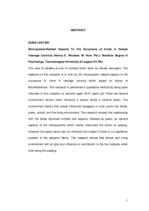 The case of stealing is one of criminal action done by female teenagers. The objective of this research is to find out the microsystem related aspects to the occurance of crime in teenage convicts which based on theory of Bronfenbrenner. This research is performed in qualitative method by doing open interview to four subjects i.e. persons aged 18-21 years old. There are several environment factors which influence a person doing a criminal action. The environment factors that mostly influenced tenageers in such action are family, peers, school, and the living environment. The research reveals that relationship with the family becomes number one aspects, followed by peers, as second aspects of the microsystems which mostly influenced the action of stealing. However the peers factor will not influence the subject if there is no significant problem in the subject’s family. The research shows that school and living environment will not give any influence or contribution to the four subjects when their doing the stealing.
