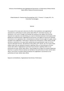 The purpose of this study was to determine the effect of job satisfaction and organizational commitment on performance of motor vehicle claims officer PT. Citra Asian Insurance. Job satisfaction is the result of thoughts and feelings that employees have degrees that illustrate important-not important, love-hate feeling, as a result of individual assessment of job aspects, both globally and multidimensional. Organizational commitment is the degree of interest and individual involvement to the organization that is characterized by individual interests against the goals, values, and goals of the organization. Performance is defined as the achievement is shown (either through attitudes or behaviors) or the output (both qualitatively and quantitatively) in each unit of time required. Data taken from (N = 25) partial loss claims officer of PT vehicles. CAI. The results of data analysis shows that, job satisfaction showed no significant effect on the performance of motor vehicle claims officer. Organizational commitment also showed no significant effect on the performance of motor vehicle claims officer. These findings do not support the research hypothesis, that there is a positive influence between job satisfaction and performance of motor vehicle claims officer, just as there is a positive influence between the organization's commitment to the performance of motor vehicle claims officer.