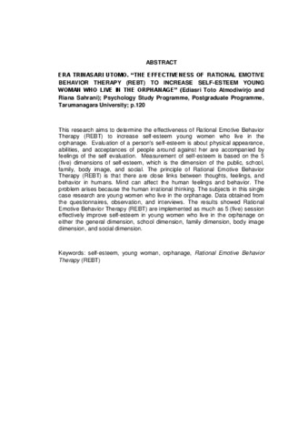Trinasari Utomo, Era (2011) Efektivitas rational emotive behavior therapy (REBT) untuk meningkatkan harga diri remaja putri yang tinggal di panti asuhan. Masters thesis, Universitas Tarumanagara.