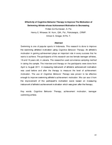 Kurniawan, Firdian Zul (2012) Efektivitas terapi CBT (Cognitive Behavior Therapy) untuk meningkatkan motivasi atlet renang yang mengalami penurunan motivasi berprestasi). Masters thesis, Universitas Tarumanagara.