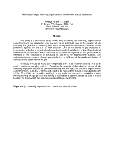Natalia P.T., Thresya (2012) Identifikasi job insecurity, komitmen organisasi dan kepuasan kerja. Masters thesis, Universitas Tarumanagara.