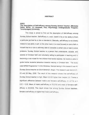 This study is aimed to find out the description of Seif-efficacy among Sunday School teacher. Self-efficacy is, one's belief in his or her ability to finish a particular job that he or she is intended to. Basically, self-efficacy is not closely t related to real ability it self; on the other hand, it is more focused on one's faith in ih , himself that he or she is definitely able to complete a certain duty or task to solve problems. Sunday School teacher is a person that understands, accepts, and . aweres of Christian faith. and voluntarily willing to participate in teaching and in becoming a role model for the children that he/she teaches. So he/she is able to guide his/her students behaviour towards maturity in Christian faith. The study used SPSS Programme 11.0 for Windows. Sample taking in this research was 40 Sunday School teacher at GSJA Betlehem, Bogor. This research was held on 21. 23 and 28 May, 2006. The result of this research shows that seif-efficacy of Sunday School teacher is high, Mean 3,0125 higher than median 2.5. Theres a significant difference between males and female's self-efficacy. ”t: 2712, p 0,01 < 0,05. Mean of male's self-efficacy is 78.3750 and mean of females self- efficacy is 85,8438. This result shows that among Sunday School teachers, female's self-efficacy is higher than maie's self-efficacy-