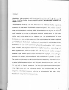 "The purpose of this study is to learn about how every individual who has experience abortion in the past dealing with their self-acceptance right now. The research has been done with 5 subjects and the range of age would be from 22'to 30 years old. Abortion could happened or occurred to every single individual. Abortion would be one of the easiest way to kill/get away from the unwanted child. Lots of reasons could be found behind someone who wants to do abonion. When you stopped in the middle of aborting your child, it could affect not only you but as well your child which could show physically dysfunctional or even worst would effecting the child's psychologist or child's emotions (feels unwanted, feels rejected, emotional and etc).Self acceptance is something that every single individual should have within them self. This research could be completed because of the answers from surveys and interviews to peOple whose willing to contribute. The surveys and interviews has been started from Aug 2005 to Apr 2006. The results and information that we have received from the surveys and interviews was compared to the theories of Hurlock (1974/1991) and Seligman (Riany et al., 1997) from their book with the title self acceptance. The result from the comparison showing that every single person who has experience abortion can still/could accept their self- acceptance without blaming anyone and grow up to be someone who has a strong character who except all of their life experience.