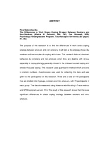 "The purpose of this research is to find the differences in work stress coping strategy between smokers and non-smokers. It will look at the strategy chosen by smokers and non-smokers in coping with stress. This research looks at dominant behaviors by smokers and non-smokers when they are dealing with stress, especially in coping strategy generally chosen in the problem-focused coping and emotion-focused coping. This research uses quantitative method which presents in statistic numbers. Questionnaire was used for collecting the data and was given to the participants for this research. There are a total of 140 participants that are divided into 2 groups, smokers and non-smokers, with 70 participants in each group. The data is measured using Manova with Hotelling’s Trace method and SPSS program version 11.5. The result of this research shows that there are significant differences in stress coping strategy between smokers and non-smokers.