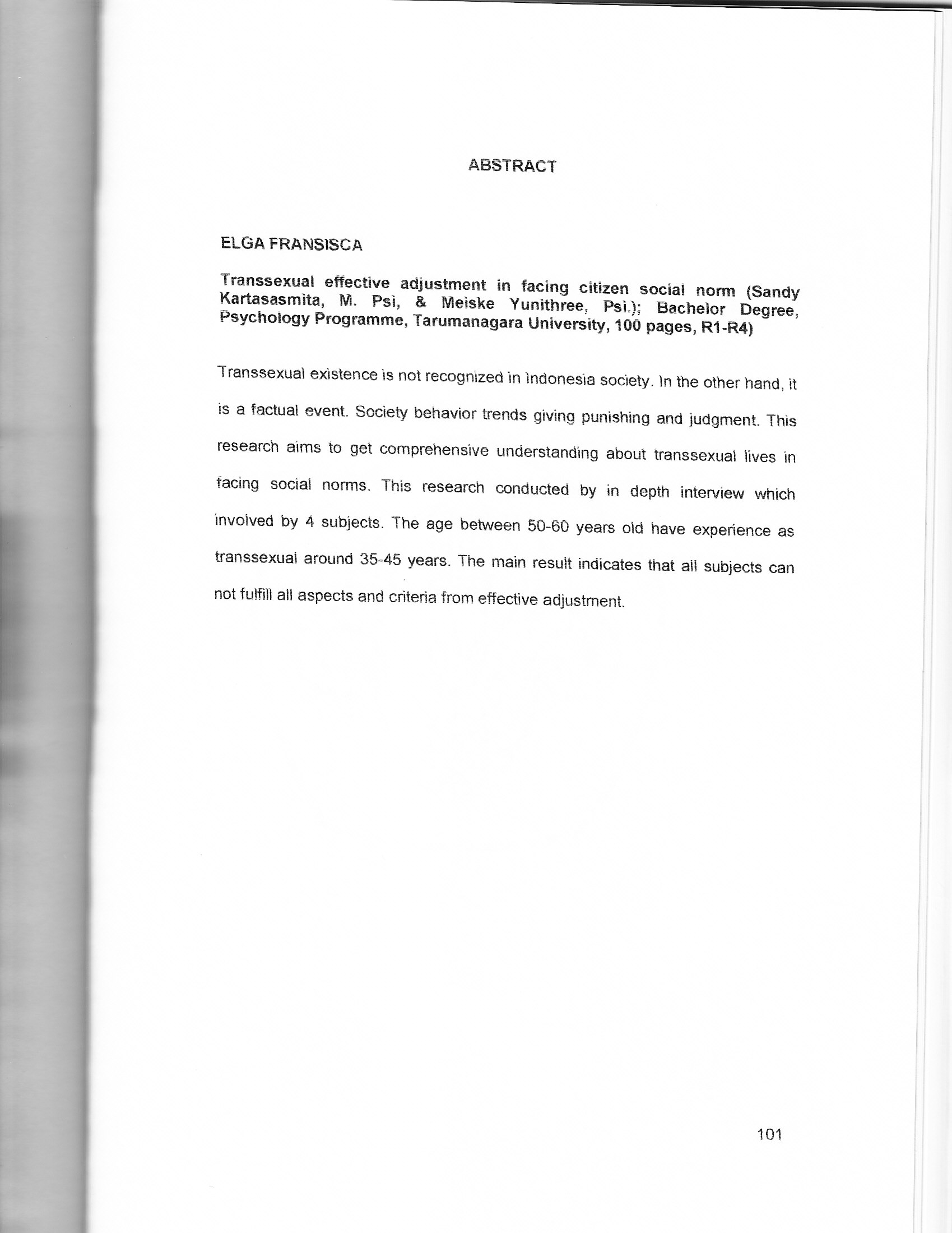 "Transsexual effective adjustment in facing citizen social norm (Sandy Kartasasmita, M. Psi, & Meiske Yunithree, Fei.); Bachelor Degree, 1 Psychology Programme, Tarumanagara University, 100 pages, R1-R4) Transsexual existence is not recognized in indonesia society. in the other hand, it is a factual event. Society behavior trends giving punishing and judgment. This research aims to get comprehensive understanding about transsexual lives in facing social norms. This research conducted by in depth interview which involved by 4 subjects. The age between 50-60 years old have experience as 31 transsexual around 35:45 years. The main result indicates that all subjects can not fuiiiii all aspects and criteria from effective adjustment.