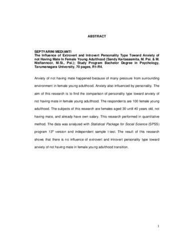 M., Septyarini (2006) Pengaruh tipe kepribadian ekstrovert dan introvert terhadap kecemasan belum memiliki pasangan pada perempuan dalam masa transisi dewasa muda. Skripsi thesis, Universitas Tarumanagara.