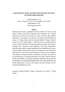 Anggraini, Yuliana (2012) Cognitive Behavior Therapy untuk menurunkan kecemasan anak kelas 6 SD terhadap ulangan matematika. Masters thesis, Universitas Tarumanagara.
