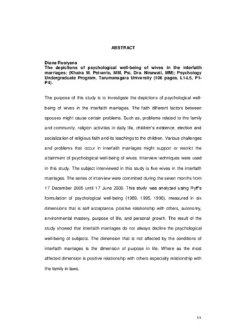 The purpose of this study is to investigate the depictions of psychological well-being of wives in the interfaith marriages. The faith different factors between spouses might cause certain problems. Such as, problems related to the family and community, religion activities in daily life, children’s existence, election and socialization of religious faith and its teachings to the children. Various challenges and problems that occur in interfaith marriages might support or restrict the attainment of psychological well-being of wives. Interview techniques were used in this study. The subject interviewed in this study is five wives in the interfaith marriages. The series of interview were committed during the seven months from 17 December 2005 until 17 June 2006. This study was analyzed using Ryff’s formulation of psychological well-being (1989, 1995, 1996), measured in six dimensions that is self acceptance, positive relationship with others, autonomy, environmental mastery, purpose of life, and personal growth. The result of the study showed that interfaith marriages do not always decline the psychological well-being of subjects. The dimension that is not affected by the conditions of interfaith marriages is the dimension of purpose in life. Where as the most affected dimension is positive relationship with others especially relationship with the family in-laws.