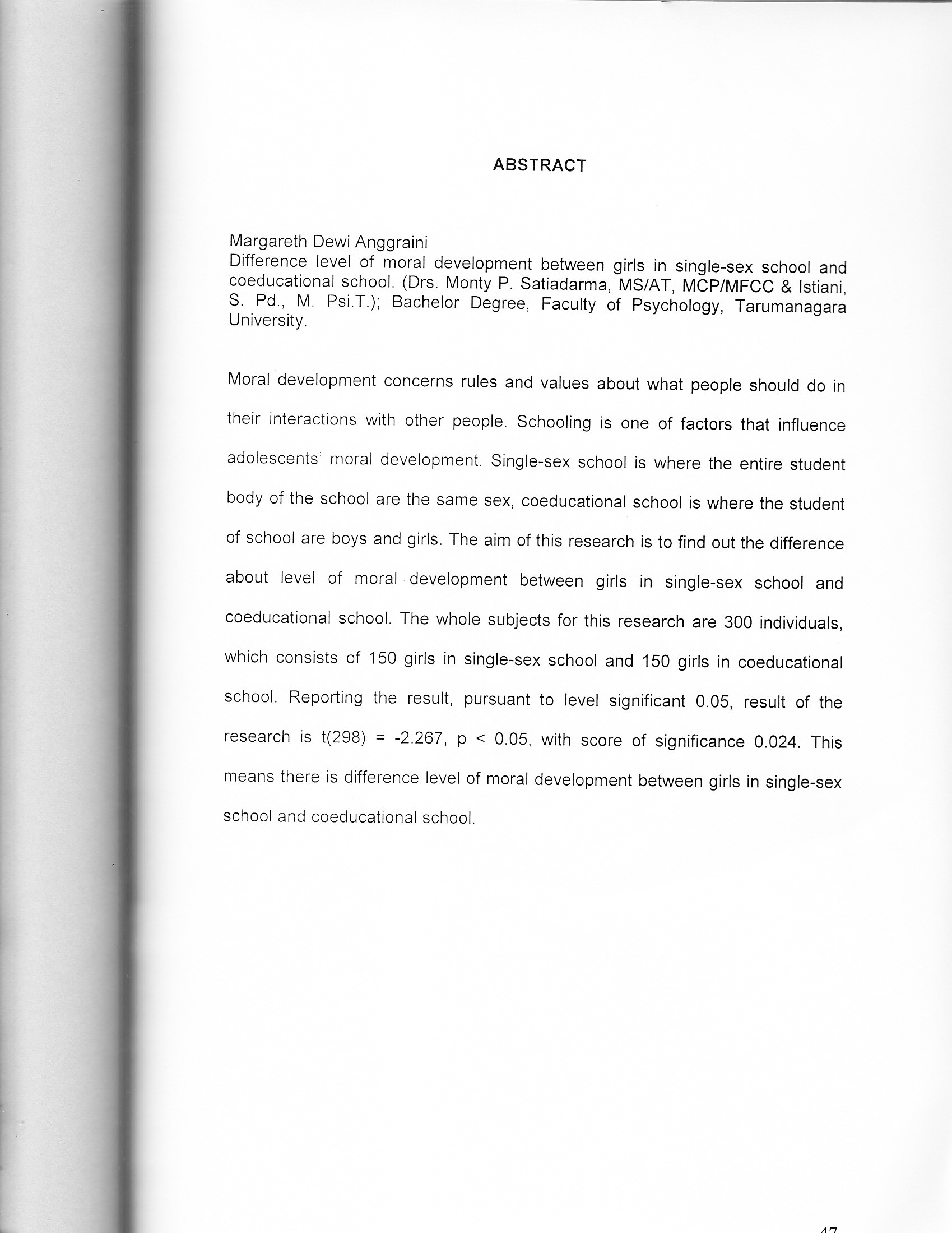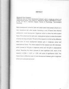 Moral development concerns rules and values about what people should do in their interactions with other people. Schooling is one of factors that influence adolescents' moral development. Single-sex school is where the entire student ir body of the school are the same sex, coeducational school is where the student of school are boys and girls. The aim of this research is to find out the difference about level of moral-development between girls in single-sex school and coeducational school. The whole subjects for this research are 300 individuals, which consists of 150 girls in single-sex school and 150 girls in coeducational school. Reporting the result, pursuant to level significant 0.05, result of the research is t(298) : -2.267, p < 0.05, with score of significance 0.024. This means there is difference level of moral development between girls in single-sex school and coeducational school.