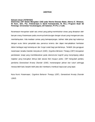 Jiwari, Edward (2012) Efektivitas Cognitive Behavior Therapy dalam mengatasi Generalized Anxiety Disorder pada perempuan dewasa muda. Masters thesis, Universitas Tarumanagara.