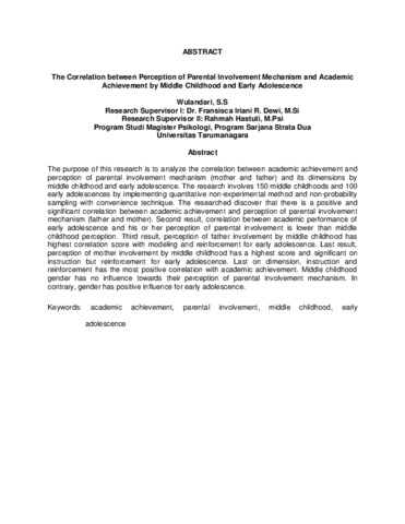 Wulandari, Wulandari (2012) Korelasi antara persepsi terhadap mekanisme keterlibatan orangtua dengan prestasi belajar pada anak usia mengah dan remaja awal. Masters thesis, Universitas Tarumanagara.