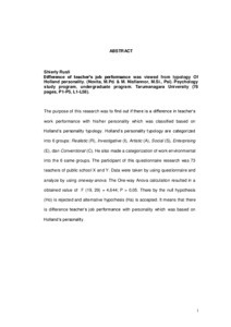 "The purpose of this research was to find out if there is a difference in teacher’s work performance with his/her personality which was classified based on Holland’s personality typology. Holland’s personality typology are categorized into 6 groups: Realistic (R), Investigative (I), Artistic (A), Social (S), Enterprising (E), dan Conventional (C). He also made a categorization of work environmental into the 6 same groups. The participant of this questionnaire research was 73 teachers of public school X and Y. Data were taken by using questionnaire and analyze by using oneway-anova. The One-way Anova calculation resulted in a obtained value of F (19, 29) = 4,644; P > 0,05. There by the null hypothesis (Ho) is rejected and alternative hypothesis (Ha) is accepted. It means that there is difference teacher’s job performance with personality which was based on Holland’s personality.