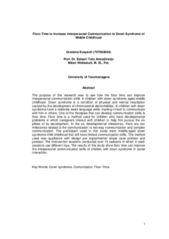 Evayanti, Greisina (2012) Floor time untuk meningkatkan komunikasi interpersonal pada anak down syndrome usia middle childhood. Masters thesis, Universitas Tarumanagara.