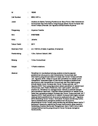 Yoanita, Aryance (2011) Analisis Isi Berita Tentang Pemblokiran Situs Porno Oleh Kementrian Komunikasi Dan Informatika Yang Dimuat Dalam Koran Kompas Dan Koran Tempo (Periode Juli-Agustus 2010)/Yoanita Aryance. Skripsi thesis, Universitas Tarumanagara.