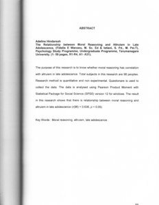 The purpose of this research is to know whether moral reasoning has correlation with altruism in late adolescence. Total subjects in this research are 98 peoples. Research method is quantitative and non experimental. Questionare is used to collect the data. The data is analysed using Pearson Product Moment with Statistical Package for Social Science (SPSS) version 12 for windows. The result in this research shows that there is relationship between moral reasoning and l altruism in late adolescence (496) = 0.636, p < 0.05).