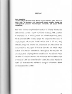 Many of the premarital sex phenomenon was found on university student at late adolescent age. Love play a key role on premarital sex (Young, 1995). Love have components, such as intimacy, passion, and commitment (Stemberg, 1987). The 3 components differ in various peOple. The components of love occur in varying degrees will produces 8 kinds of love, such as non love, liking, infatuation, empty love, romantic love, companionate love, fatuous love, and; consummate love. The purpose of this study are to find out Jakarta college, students kinds of love in premarital sex. The subject of this study were 450 university students, comprising 250 men and 200 women. The data were analyze with SPSS 12.0 program. The result from this research showed that the average of intimacy is 4,1635 and standard deviation 0,52361; the average of passion is 4,3618 and standard deviation 0,54854; the average of commitment is 4,2756 and standard deviation 0,53658.
