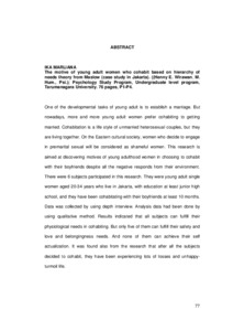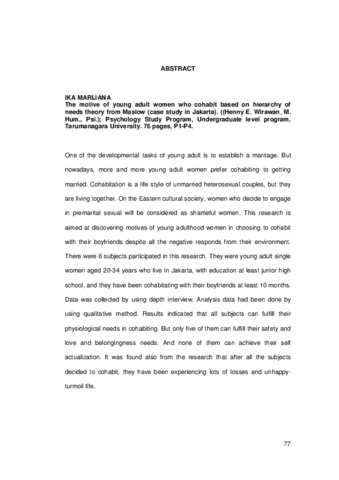 Martiaana, Ika (2006) Motif berkohabitasi pada wanita dewasa muda berdasarkan teori hierarchy of needs dari Maslow. Studi kasus di wilayah Jakarta. Skripsi thesis, Universitas Tarumanagara.