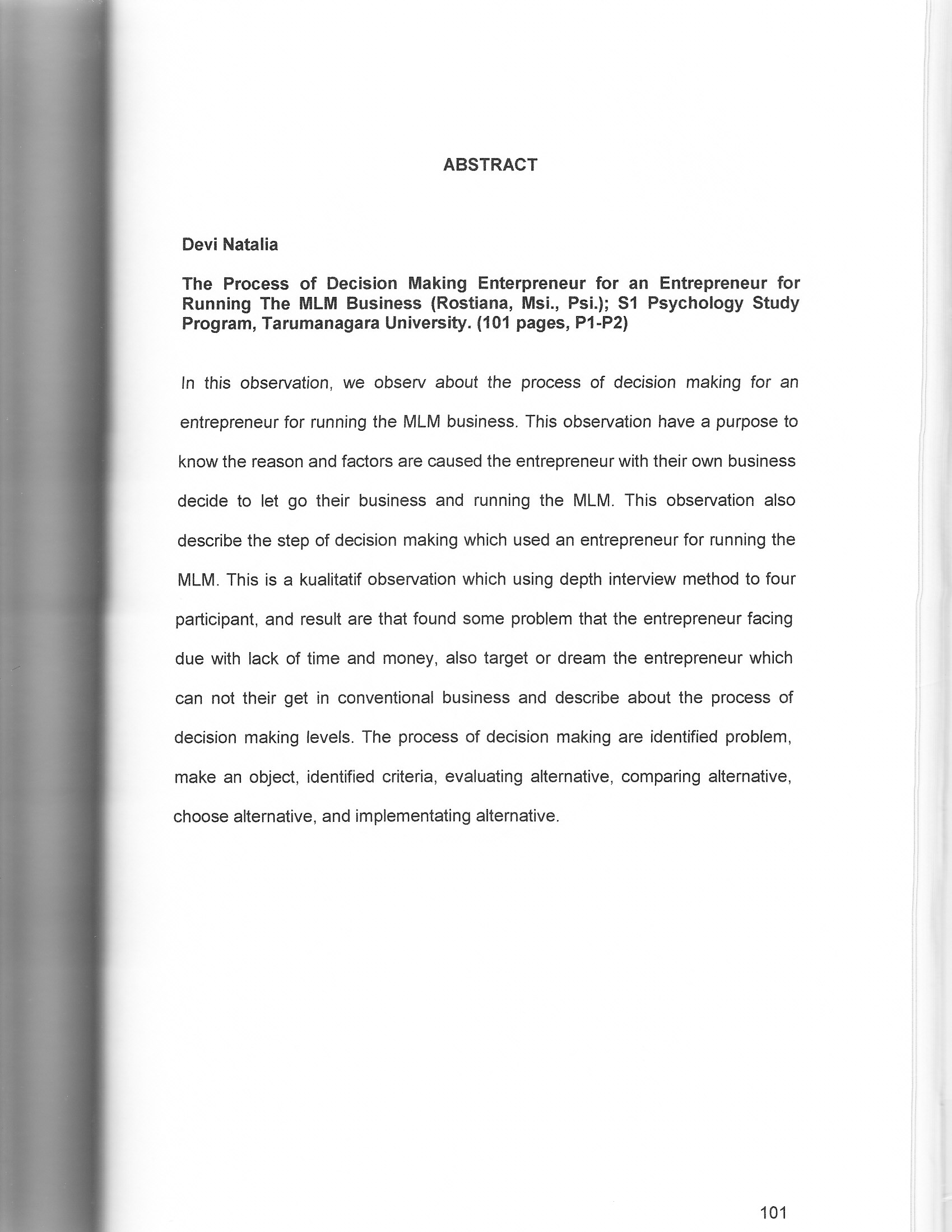 "ln this Observation, we observ about the process of decision making for an entrepreneur for running the MLM business. This Observation have a purpose to know the reason and factors are caused the entrepreneur with their own business decide to let go their business and running the MLM. This Observation also describe the step of decision making which used an entrepreneur for running the MLM. This is a kualitatif Observation which using depth interview method to four participant, and result are that found some problem that the entrepreneur facing due with lack of time and money, also target or dream the entrepreneur which can not their get in conventional business and describe about the process of decision making levels. The process of decision making are identified problem, make an object, identified criteria, evaluating alternative, comparing alternative, choose alternative, and implementating alternative.