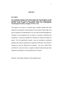 The purpose of this study is to describe about correlation between girls’ body image with the perception of self acceptance from her partner. Body image is the picture, perception and representation of our own body and physical appearance. Perception of self acceptance from her partner is a process to identifying and interpreting of a good and satisfied that influenced by thought and feeling her partner. This non-experimental research, using the quantitative correlational approach and using the questionnaire of subjects from 200 girls. This research is analyzed by using the Spearman–rho-correlation. The result, r(200)=-0.460, ρ=0.000<0.01, means that there is a negative correlation between the girls’ body image with the perception of self acceptance from her partner.