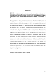 The population of elderly in Indonesia increases. Predicted in 2010, total of elderly will become 28,8 millions people or 11.34% from people in Indonesia and life expectancy will become 71,7 years old. Like their ages increase, they will get the limitations like in their physics, cognitive and socioemotional. Although they will suffer theirs, they never limit their needs in nursing homes. There are five respondents with age 65-88 years old who staying in a nursing house at North Jakarta. The interviews had taken in February to August 2007. After they had interviewed, the results were produced in some transcripts. The transcripts are analyzed and made resume of those. Concluded of this research is hierarchy needs of Maslow at elderly who stay in nursing home have a well satisfied until safety needs then decreased at belongingness and love needs and esteem needs. The highest need is self-actualization needs not satisfied at elderly who staying in nursing home.